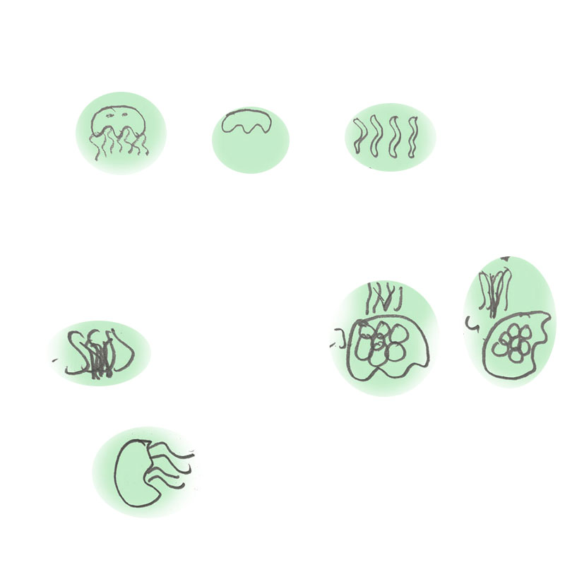 I did some ideation sketches to figure out what I wanted everything to look like. I played around with the pattern on top of the jellyfishes head